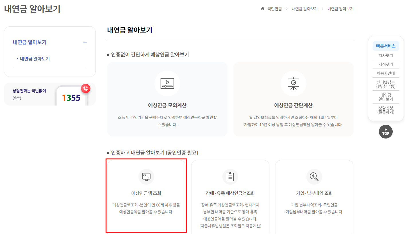 2. '예상연금액 조회'를 클릭합니다(인증필요)