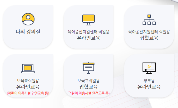 - 메인 페이지의 '보육교직원용 온라인 교육'을 클릭합니다. 또는 '개설강좌 → 보육교직원용 → 온라인교육'으로 이동합니다.